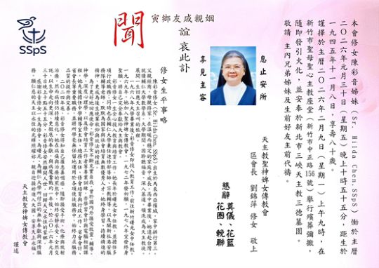我們敬愛的聖神婢女傳教會陳彩音修女(Sr. Hilda Chen, SSps)於主曆2026年1月30日結束八十一年塵世旅程後安息主懷。