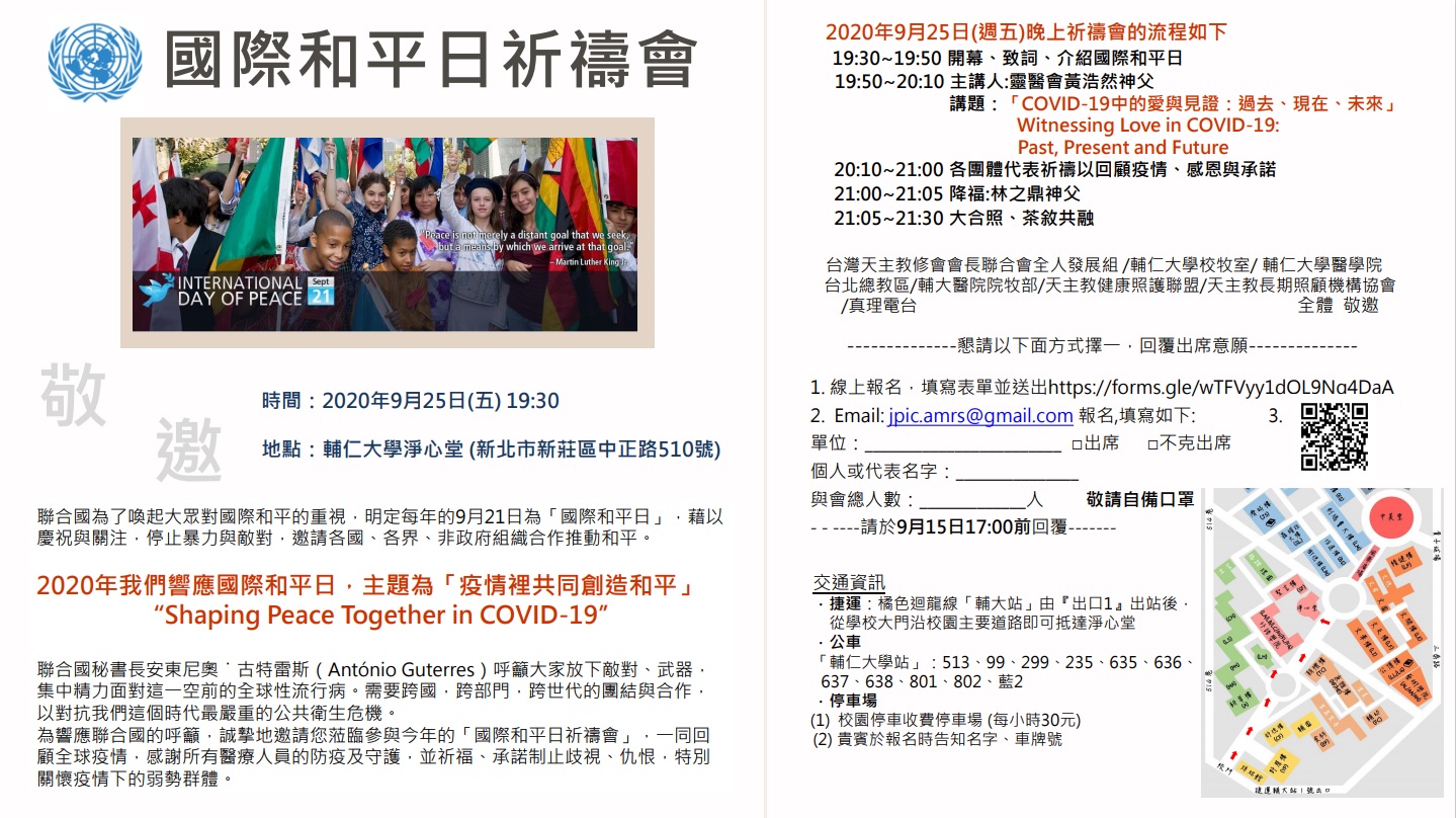 為響應聯合國的呼籲,誠摯地邀請您蒞臨參與今年的國際和平日祈禱會,一同回顧全球疫情,感謝所有醫療人員的防疫及守護,並祈福、承諾制止歧視、仇恨,特別關懷疫情下的弱勢群體。