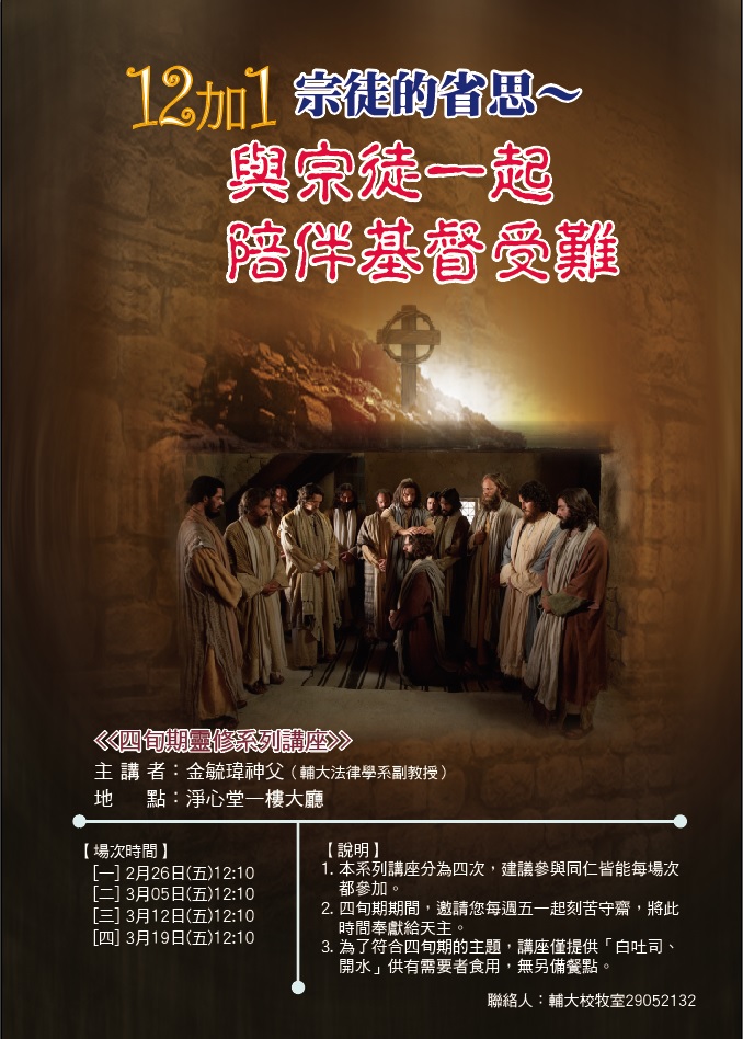 在四旬期中,校牧室邀請金毓瑋神父,為大家主講【『12+1宗徒的省思----與宗徒一起陪伴基督受難』系列講座】。邀請大家一同參與。