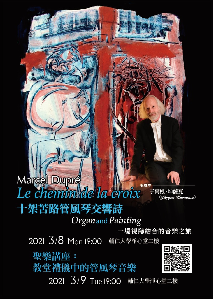 演奏家于爾根・坤薩瓦教授,任教於杜塞爾多夫地區的羅伯特・舒曼音樂學院,教授管風琴演奏和即興演奏;自2009年起擔任羅伯特・舒曼大學第二音樂學院的系主任、音樂經紀與傳播研究學院教務長以及教會音樂研究所所長。坤薩瓦教授被譽為當今德國最優秀的管風琴演奏家之一,他絢麗的藝術性、無懈可擊的技巧以及富有想像力的曲目受到觀眾和評論家的一致好評。坤薩瓦教授將演出法國作曲家杜普雷(Marcel Dupré)浪漫派交響曲風格之傑作《十架苦路管風琴交響詩》作品第29號,本曲長達一小時,為杜普雷最長的管風琴作品。1932年首演時逐段朗讀克洛岱爾的詩句,每次讀一段,也就是苦路中的一站,並由杜普雷加上一段即興演奏。本場音樂會亦結合德國畫家史特拉特曼繪製十四幅現代畫,以音樂和繪畫講述十架苦路14站。