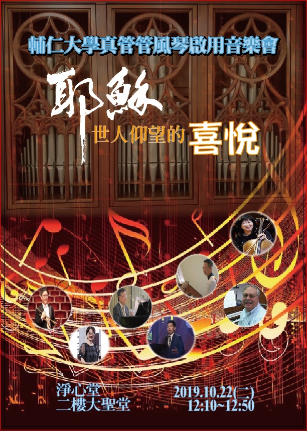 在傳統上,新琴祝聖禮為管風琴「開光」-開天主的光,將琴獻於上主;而新琴啟用音樂會則為天主所鍾愛的子民「開心」-開世人的心,以聖樂讚美歌頌天主的美妙化工。就讓我們以喜宴辦桌的心情,開心地慶祝本校的大喜事,邀請大家來到淨心堂聆賞以下精彩演出: